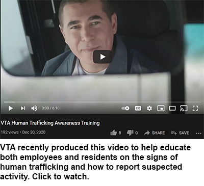 Among VTA’s resources to combat Human Trafficking is a $350-thousand- dollar grant from the Federal Transit Administration. VTA is augmenting the grant with its own funding and plans an extensive campaign with the theme Not on Transit (NoT) to reach out to its riders for training, public education, and enhancing its mobile security app VTAlerts to be used to report incidents that happen on transit.
