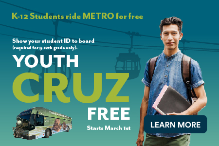 The Youth Ride Free pilot program eliminates fares in order to increase access and encourage ridership for youth in grades K-12. The program will enable youth to ride on all METRO routes (excluding Highway 17) anywhere, anytime. According to a survey conducted by METRO in 2019, just 9.7 percent of METRO riders are under the age of 18, despite making up 19 percent of the population of Santa Cruz County.