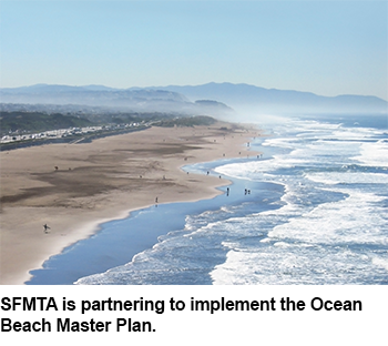 SFMTA is working with Caltrans, the Coastal Commission, and the National Park Service to implement the Ocean Beach Master Plan to protect critical municipal infrastructure, improve public access, and address sea level rise. The agency is also partnering with the Port of San Francisco on the Waterfront Resilience Program to reduce the flood and earthquake risk along 7.5 miles of the city’s waterfront and improve its critical transportation infrastructure.