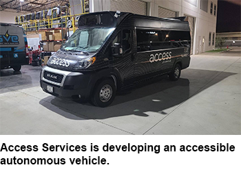 Access Services has also built an accessible autonomous vehicle, the first in the U.S. that satisfies all four necessary requirements: the ADA, Federal Motor Vehicle Safety Standards (FMVSS), Altoona crash test regulations, and Buy America requirements. Built with the help of a $120,000 federal grant, the vehicle was completed in October 2021 and is scheduled to undergo a closed-environment, SAE Level-four (driver in the vehicle but not actively driving) test at the LA Convention Center in September 2022.