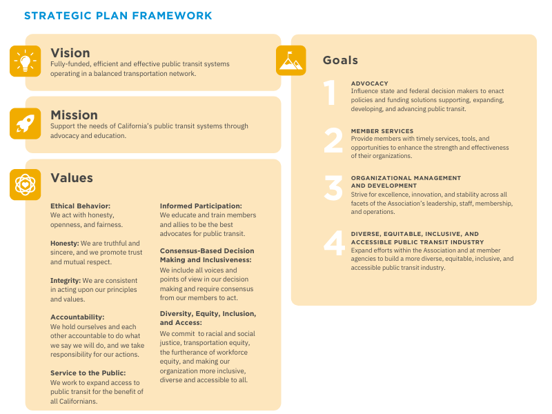 “Under the last strategic plan, the Association helped deliver major legislative, regulatory, and budgetary victories that are helping to transform our industry,” said Executive Director Michael Pimentel. “These victories include, among other things, the historic passage of Senate Bill 1, providing approximately $1 billion in new funding for capital and operations to California’s transit agencies annually; the negotiation and successful implementation of the Innovative Clean Transit regulation, which will facilitate the transition of all transit buses in California to zero-emission technologies by 2040; the enactment of numerous sponsored bills; and the enactment of one-time COVID-19 relief measures, including new federal funding, and state-level statutory and regulatory relief.”
