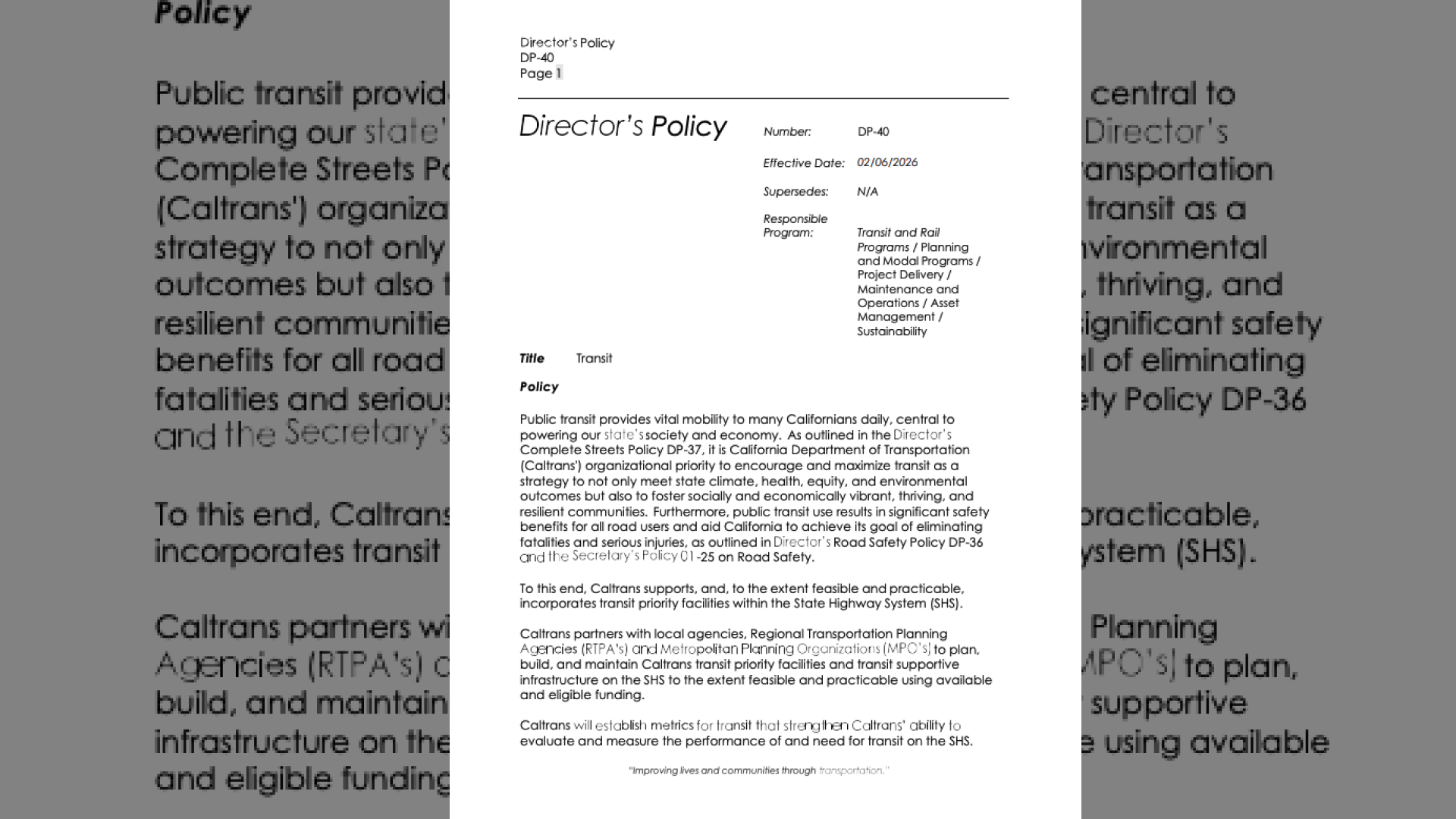 “The Director's Transit Policy is focused on three key pillars: Planning, Projects, and Data, committing Caltrans to utilizing design flexibility and context-sensitive solutions to enhance transit networks for travelers of all ages and abilities,” wrote El-Tawansy in a 2025 letter announcing the draft policy’s comment period.