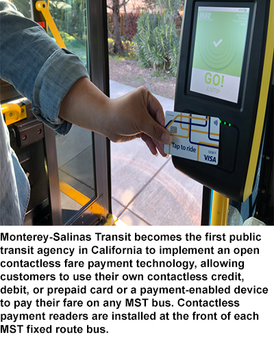 To Kotler’s point, in May, MST became the first public transit agency in California to implement an open contactless fare payment technology, that allows customers to use their own contactless credit, debit, or prepaid card or a payment-enabled device to pay their fare on any MST bus—just like they tap to pay for a coffee, groceries, or a meal. MST’s six-month contactless payments demonstration is the first of many facilitated by the California Integrated Travel Project (Cal-ITP), a Caltrans initiative to enable easy and accessible travel planning and payments.