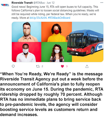 The unprecedented times that the novel coronavirus pandemic put into motion beginning in early March 2020 stripped public transit of riders. What came into clear focus was the critical mobility needs of the transit dependent, healthcare workers, first responders, social service providers, childcare workers, grocery store employees, and other essential workers that were exempt from Governor Gavin Newsom’s call to shelter-in-place. Though ridership decreased dramatically in observance of the Governor’s directive, California public transit agencies continued to serve customers daily.