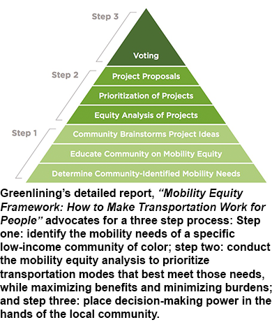 At its core, the Mobility Equity Framework gives communities and advocates a tool to analyze, evaluate, and compare different transportation modes based on their ability to enhance mobility, improve health, and increase economic opportunities for low-income communities of color.
