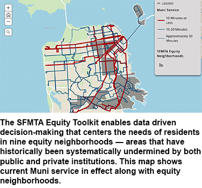 SFMTA Public Relations Officer Mariana Maguire stated in a blog post, “The SFMTA Equity Toolkit helps us improve Muni service for San Francisco’s most transit-dependent residents and essential workers. Using data layered with mapping we are able to improve access to jobs and key destinations by identifying and fixing gaps in service.”