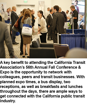 A key benefit to attending the conference is the opportunity to network with colleagues, peers, and transit businesses. With planned expo times, a bus display (located in the expo), two receptions, breakfasts and lunches throughout the days, there are ample ways to get connected with the California public transit industry.