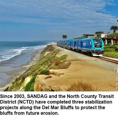 While SANDAG and NCTD work to stabilize the bluffs, SANDAG is seeking additional funding to expedite the process of moving the bluffs inward as a long-term strategy. The funds needed will increase the reliability of passenger rail service for nearly 8 million annual passengers and keep nearly $1 billion a year of goods consistently moving through the corridor.