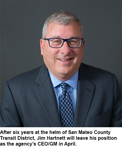 Association Executive Committee Member Jim Hartnett recently announced that he would leave his position as CEO/GM of the San Mateo County Transit District in April. At that time, Deputy CEO/GM Carter Mau will become Acting CEO/GM and Caltrain’s Chief Officer of Rail Michelle Bouchard will serve as Acting Caltrain Executive Director.