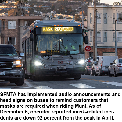 - Mask distribution is up – SFMTA Transit Information Program (TIP) staff distributed over 14,000 masks to customers the week of November 16.