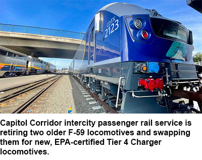 Capitol Corridor Joint Powers Authority (CCJPA), which manages Northern California’s Capitol Corridor intercity passenger rail service, is retiring two older F-59 locomotives and swapping them for new, EPA-certified Tier 4 Charger locomotives. Caltrans Division of Rail and Mass Transit purchased the new locomotives to be used specifically for the Capitol Corridor, and the project was funded by the Bay Area Air Quality Management District and co-funded by Sacramento Metropolitan Air Quality Management District and Placer County Air Pollution Control District through the Carl Moyer Grant Program.