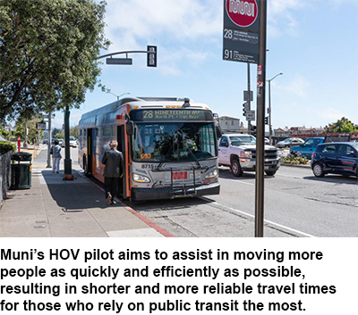 San Francisco Municipal Transportation Agency (SFMTA) Muni buses and private vehicles with two or more occupants will soon see an innovative solution for San Francisco: High Occupancy Vehicle lanes (HOV) on city streets. Approved by a 5-1 vote in April by the SFMTA Board of Directors, the historic pilot program, in partnership with Caltrans, aims to increase person-carrying capacity and improve transit reliability on several major corridors through Golden Gate Park, the Marina District, and Cow Hollow.