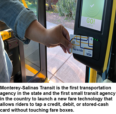 This month Monterey-Salinas Transit (MST) became the first public transit agency in California to implement an open contactless fare payment technology, allowing customers to use their own contactless credit, debit, or prepaid card or a payment-enabled device to pay their fare on any MST bus. The ability to tap and ride removes the need to stand in line to purchase a separate transit card, load a special app, or handle cash while boarding.