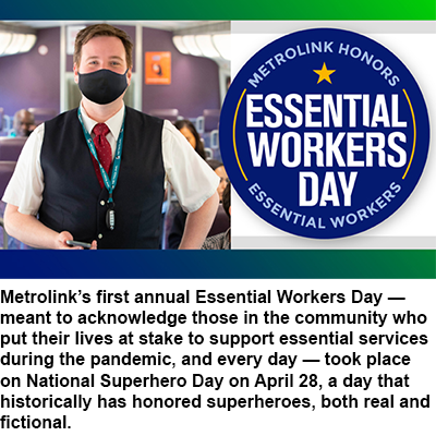 Metrolink officially recognized the herculean efforts of the Southern California region’s essential workers by celebrating Essential Worker Day, an annual recognition on April 28, a day historically celebrated as National Superhero Day. The agency invited all riders to thank essential workers on that day.
