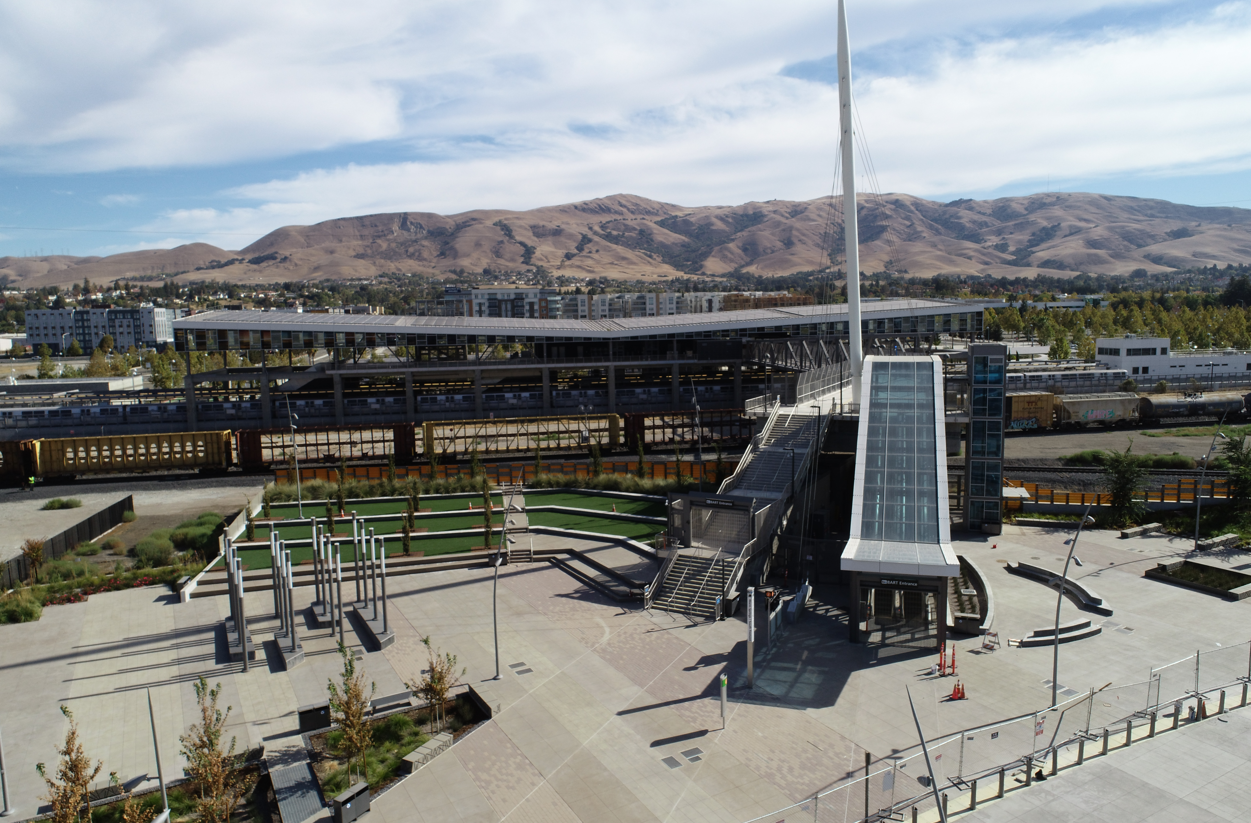 The Warm Springs/South Fremont Station opened for service in 2017 and boasts eye-catching art installations, solar panels, and EV charging stations as well as other environmentally sustainable features.