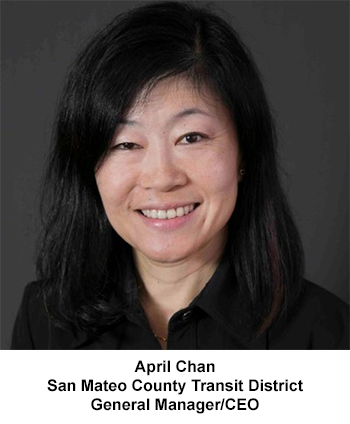 April Chan is General Manager/CEO of the San Mateo County Transit District’s (District). She is a 20-plus-year veteran of the agency, which is the mobility manager for San Mateo County, operating SamTrans fixed-route buses and Redi-Wheels and RediCoast paratransit. She is also responsible for services provided by the District to both the Peninsula Corridor Joint Powers Authority, which owns and operates the Caltrain commuter railroad, and the San Mateo County Express Lanes Joint Powers Authority.