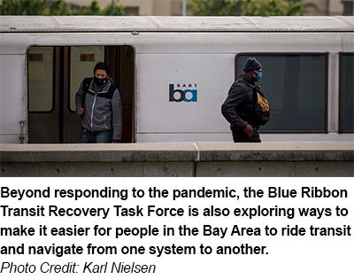 At the heart of this effort is the Blue Ribbon Transit Recovery Task Force for which I serve as Chair. Formed last spring by the Metropolitan Transportation Commission (MTC) following its April 2020 allocation of federal CARES Act funds, the 32-member Task Force includes other local elected officials; Assemblymember David Chiu (D-San Francisco); California State Transportation Agency Secretary David Kim; general managers of large and small transit operators; business and labor groups, as well as advocates for people with disabilities; and transit and social justice advocates.