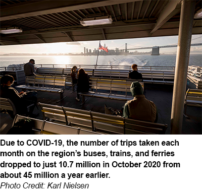 With almost 8 million residents living across nine counties and 101 cities, the Bay Area is home to one of the largest public transit networks in the U.S. and the highest share (12 percent) of commute trips taken on transit in California. Due to COVID-19, the number of trips taken each month on the region’s buses, trains, and ferries dropped to just 10.7 million in October 2020 from about 45 million a year earlier. Fare revenue has fallen even more steeply — closer to 90 percent — due to proportionally higher ridership declines on rail and ferry systems with higher fares. The result is a crisis for Bay Area transit like never before.