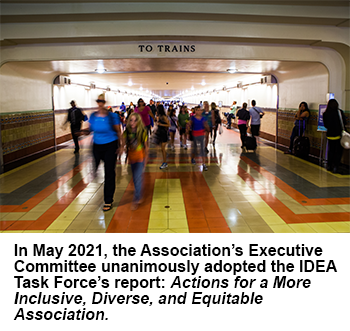 In May 2021, the Executive Committee unanimously adopted the IDEA Task Force’s report: Actions for a More Inclusive, Diverse, and Equitable Association. The report groups the Association’s actions into the areas of advocacy, member services, and organizational management and development, noting key committees, objectives, tactics, and aspects of accountability and reporting for each. Here we will highlight the objectives identified in each of the three areas.