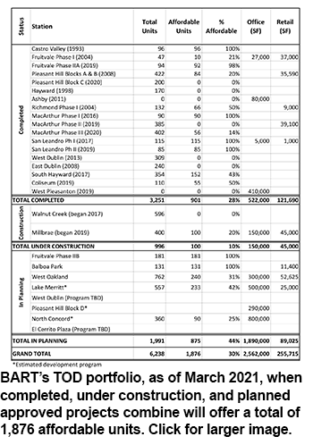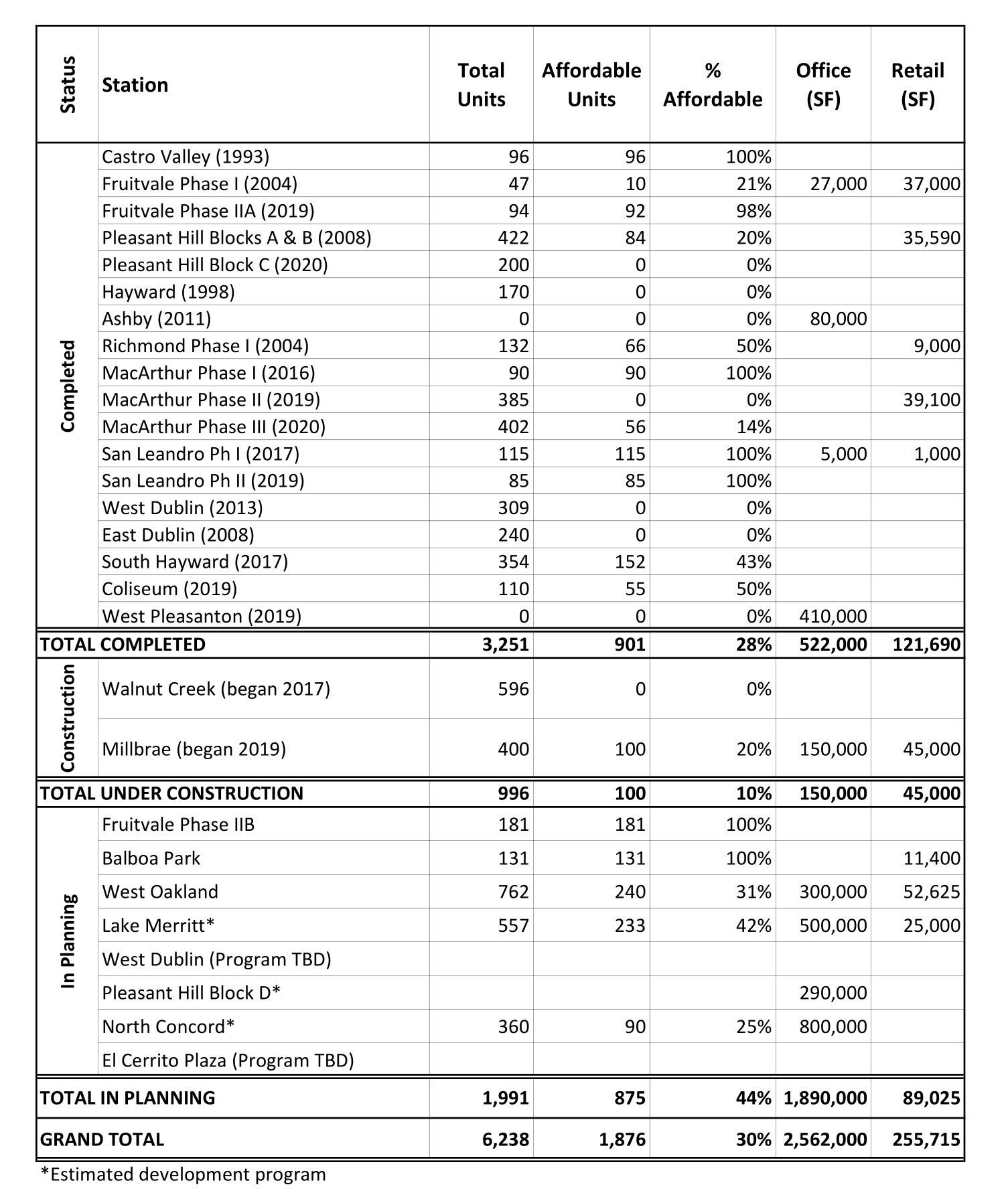 According to the agency, BART has 13 completed projects, four under construction projects, and seven approved projects in the pipeline. BART also owns an estimated 250 acres at 27 stations that could accommodate future development.