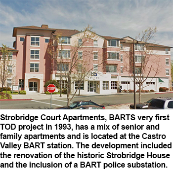 BART has a strong history of TOD efforts. The agency partnered with BRIDGE housing in 1993 to build its first TOD project: the Strobridge Court Apartments. The $75 million project included a mix of 96 senior and family one-, two-, three-, and four-bedroom apartments located at the Castro Valley BART station, the renovation of the historic Strobridge House, and a BART police substation. The Metropolitan Transportation Commission conferred its Grand Award upon Strobridge Court, and the project also received the Pacific Coast Builders Conference Gold Nugget “Best in the West” award.