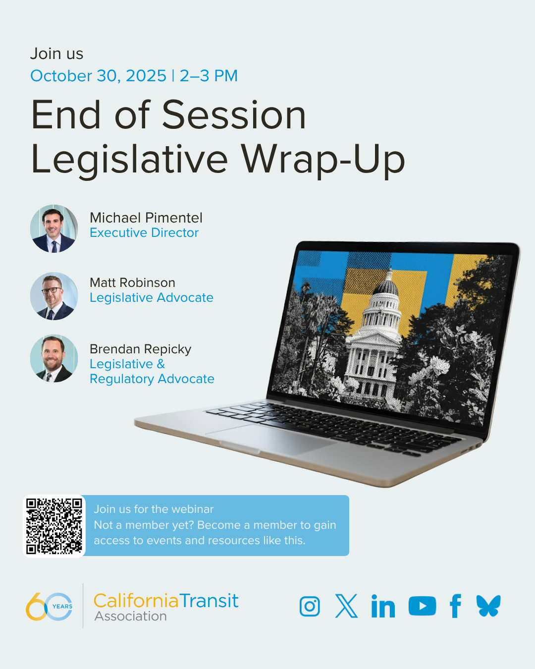 As we conclude the first year of the 2025-26 State Legislative Session, Association staff will provide Association members with an update and review of the Association’s sponsored legislation and high-priority bills, as well as a review of the final Fiscal Year 2025-26 State Budget Act and the Cap-and-Invest legislation. This webinar will be presented by the Association’s Executive Director Michael Pimentel, Legislative Advocate Matt Robinson, and Legislative and Regulatory Advocate Brendan Repicky.